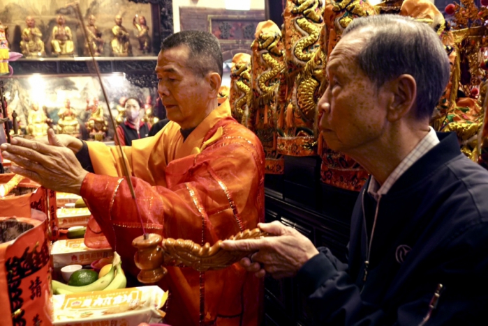 儘管天氣有些陰暗,氣溫下降,絡繹不絕善男信女依舊到萬和宮,祈求媽祖保佑閤家平安,香火繚繞;前後殿的供桌都擺滿信眾供奉的素果、素麵等供品,相當壯觀。