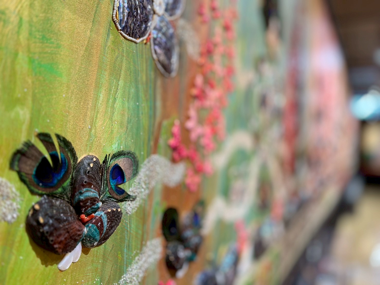 展覽最大亮點之一,是全台首件運用傳統螺鈿工藝創作的巨型媽祖藝術作品。作品全長達1080公分,歷時一年完成,將貝殼材質細緻鑲嵌於畫面之中,在光線折射下呈現出絢麗光澤,展現傳統工藝與現代藝術融合的創新表現。