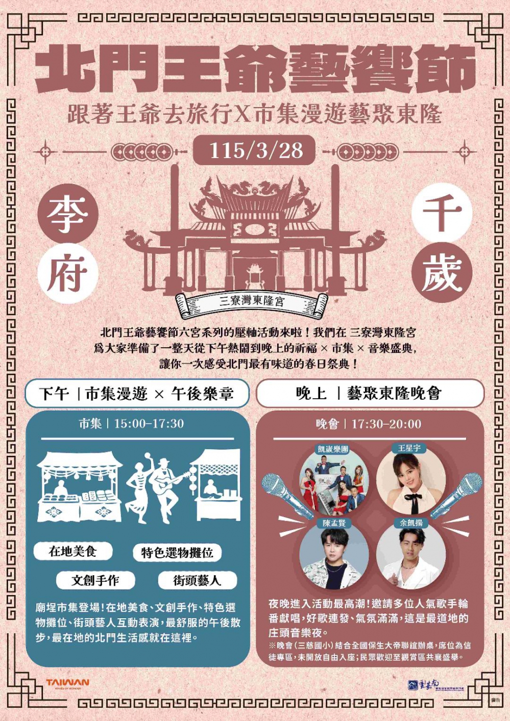 [記者黃永豐台南報導]由交通部觀光署雲嘉南濱海國家風景區管理處(以下簡稱雲管處)推動的「北門王爺藝饗節」,自去年11月開跑以來深受好評,這場串聯台南北門六大宮廟的文化旅程,即將在3月28日於三寮灣東隆宮迎來最受期待的「最終場壓軸活動」。現場將透過午後市集與晚間的大型聯歡演唱會,帶領民眾在春意盎然的週末,深入體驗濱海信仰的多元魅力與熱情。