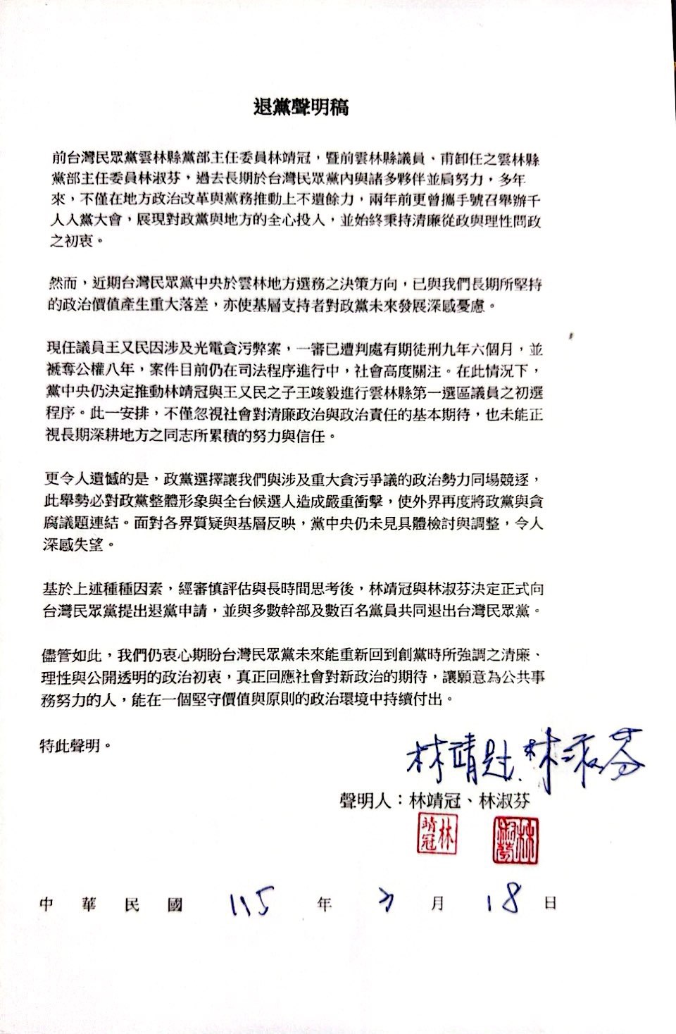 據了解,兩人在聲明中回顧多年黨務歷程,強調曾與地方夥伴共同推動改革理念,致力於建立清廉、透明的政治文化,也曾成功動員千人參與入黨活動,為地方組織奠定基礎。