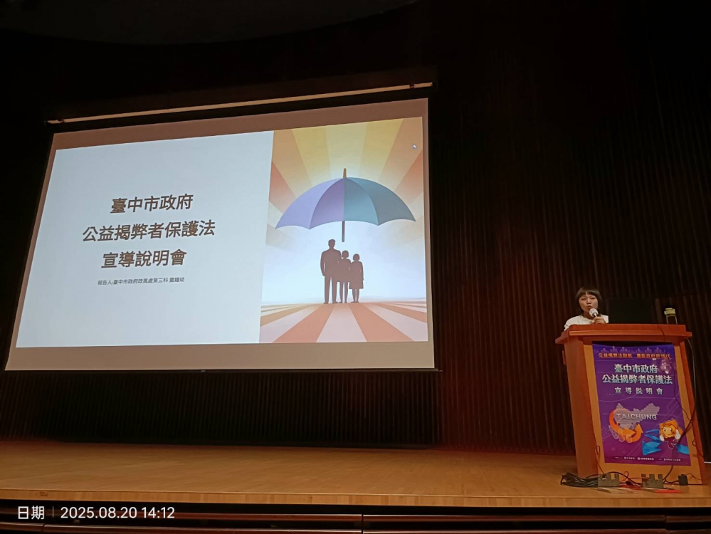 【記者林獻元台中報導】為落實市長盧秀燕「陽光政治 效能政府」的理念,台中市政府政風處規劃4場次宣導活動及教育訓練,包括「AI創造力x廉能新視界:公益揭弊實作坊II」、「115年度公益揭弊者保護法宣導說明會」、「首長廉政倫理『誠』長圈」及「企業誠信宣導活動」等,邀請市府長官同仁及與市府訂有契約關係而提供勞務的廠商參與,希望透過法規範的介紹,鼓勵大家勇於揭弊。
