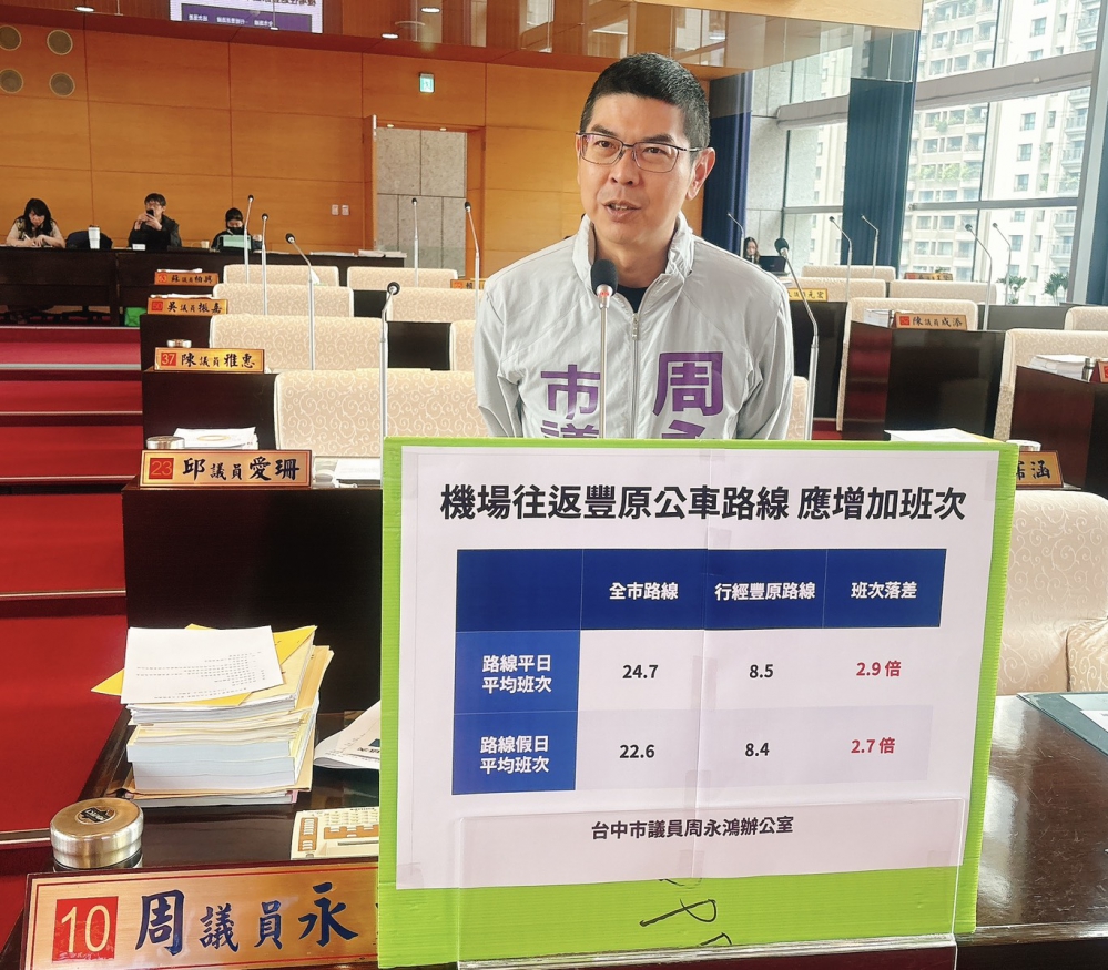 周永鴻指出,台中國際機場公車路網共21條路線,其中行經豐原的僅8條。根據辦公室統計,行經豐原路線平日平均班次僅8.5班,全市路線平日平均則為24.7班,落差達2.9倍;假日行經豐原路線平均8.4班,全市路線平均22.6班,落差也有2.7倍。