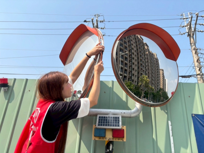 台中市太平區新高里長江姿樺表示,這次活動由鄰長領隊,分成四小隊,各隊負責一個路線,透過人力一面、一面定點擦拭反光鏡,過程中要注意車流及交通情況,也會遇到有點受損的鏡面,其實也很不容易,謝謝這些年輕人,讓里內志工隊也能參與其中,發揮在地引路功用。