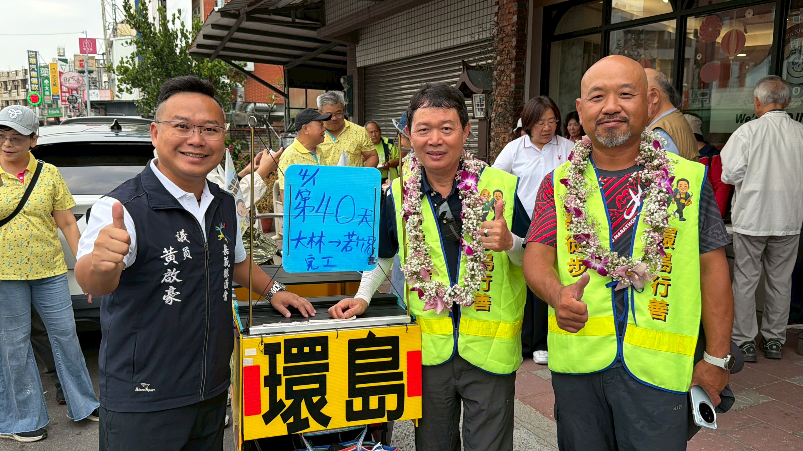 「喜樂徒步・環島行善」歷時40天跨越台灣各地,在縣議員黃啟豪、民雄鄉長林于玲等人相迎抵達起點民雄若竹兒。(圖/ 黃啟豪議員服務處提供)