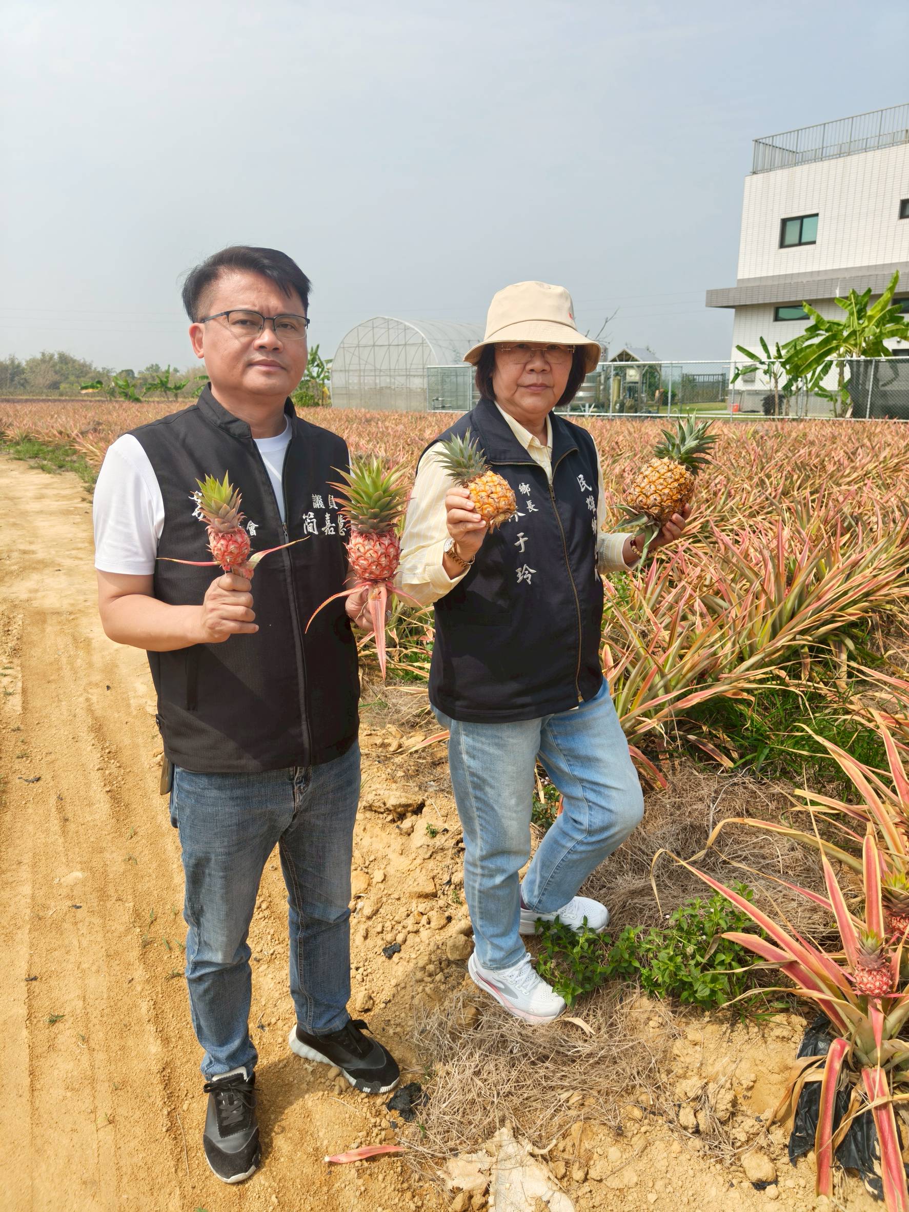 林于玲鄉長與簡嘉億議員關心民雄鄉鳳梨受乾旱影響生長不良,現場會勘關心農民。(圖/民雄鄉公所提供)民雄鄉公所呼籲,相關單位應持續關注氣候變化對農業的影響,並提前部署因應措施,以維護農民權益與農業生產穩定。