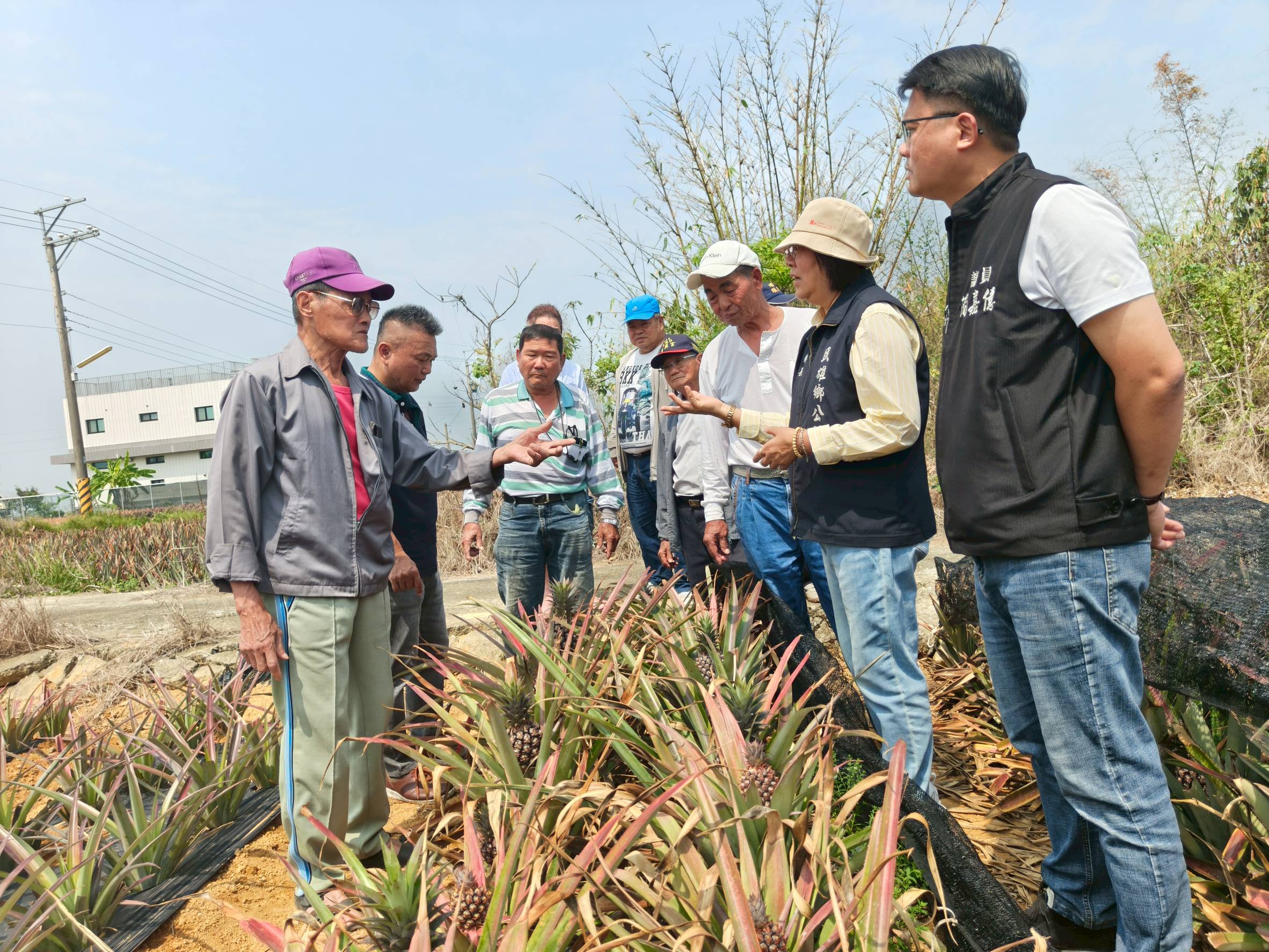 林于玲鄉長表示,今年氣候異常,降雨量偏低,鳳梨正值重要結果期,水分不足將影響果實膨大與品質不佳,進而降低產量與市場價值,農民壓力沉重。現場除實地查看鳳梨植株狀況外,也聽取農民反映目前灌溉水源不足、成本增加等問題。