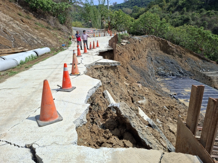 【記者林重鎣台中報導】台中市霧峰區桐林里暗坑巷去年7月底因連日豪雨,上方邊坡滑落道路中斷,水利局搶通便道後正進行災後復建工程,但4日大雨一來,便道路基又被掏空崩坍,民進黨市議員張芬郁表示,中央災後工程已核定1600萬,憂心難進行,水利局表示,將暫封閉改道,全速進行復建工程,希望在五月底以前完工。