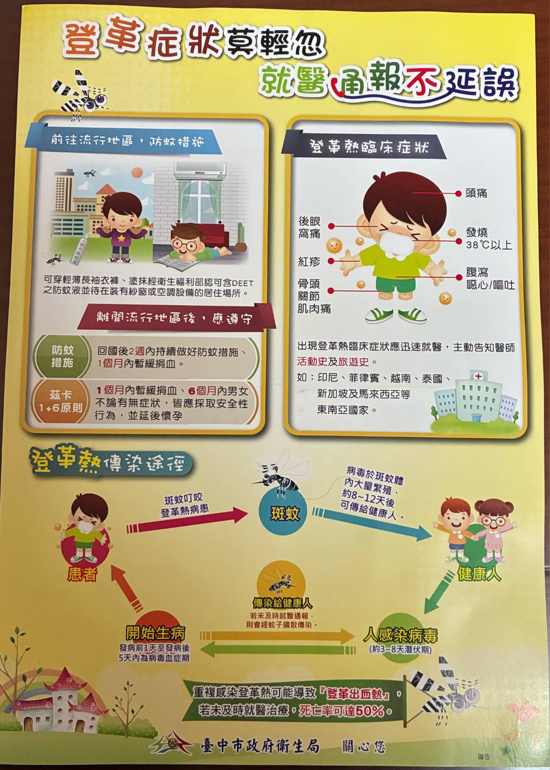 台中市衛生局呼籲、一旦出現上述任何一種或多種症狀、尤其是在曾到訪登革熱流行地區後、應立即尋求醫療協助、迅速就醫、就醫時務必主動告知醫師近期的活動史及旅遊史、特別是是否曾前往登革熱高風險地區、這些資訊對於醫師進行準確診斷、判斷是否為登革熱、並安排適當的治療或隔離措施、有著決定性的作用、早期診斷、早期治療、不僅能減少重症發生的機率、也能有效阻斷病毒的進一步傳播、保護更多無辜的市民免受其擾。