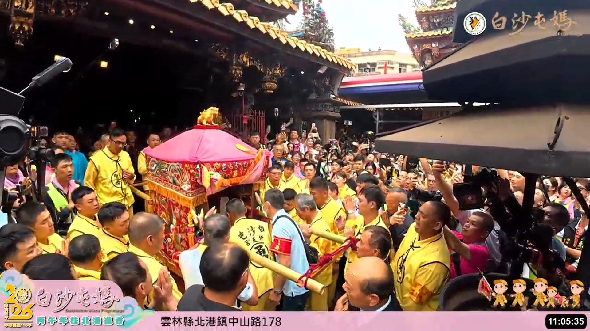 白沙屯媽祖與山邊媽祖、爐主媽於當日中午11時01分完成三進三退入廟儀式,在信眾齊聲高呼與彩帶飛舞中衝入廟門,氣氛沸騰。信徒表示,今年進廟時間較去年提前約1小時20分,行進速度驚人。
