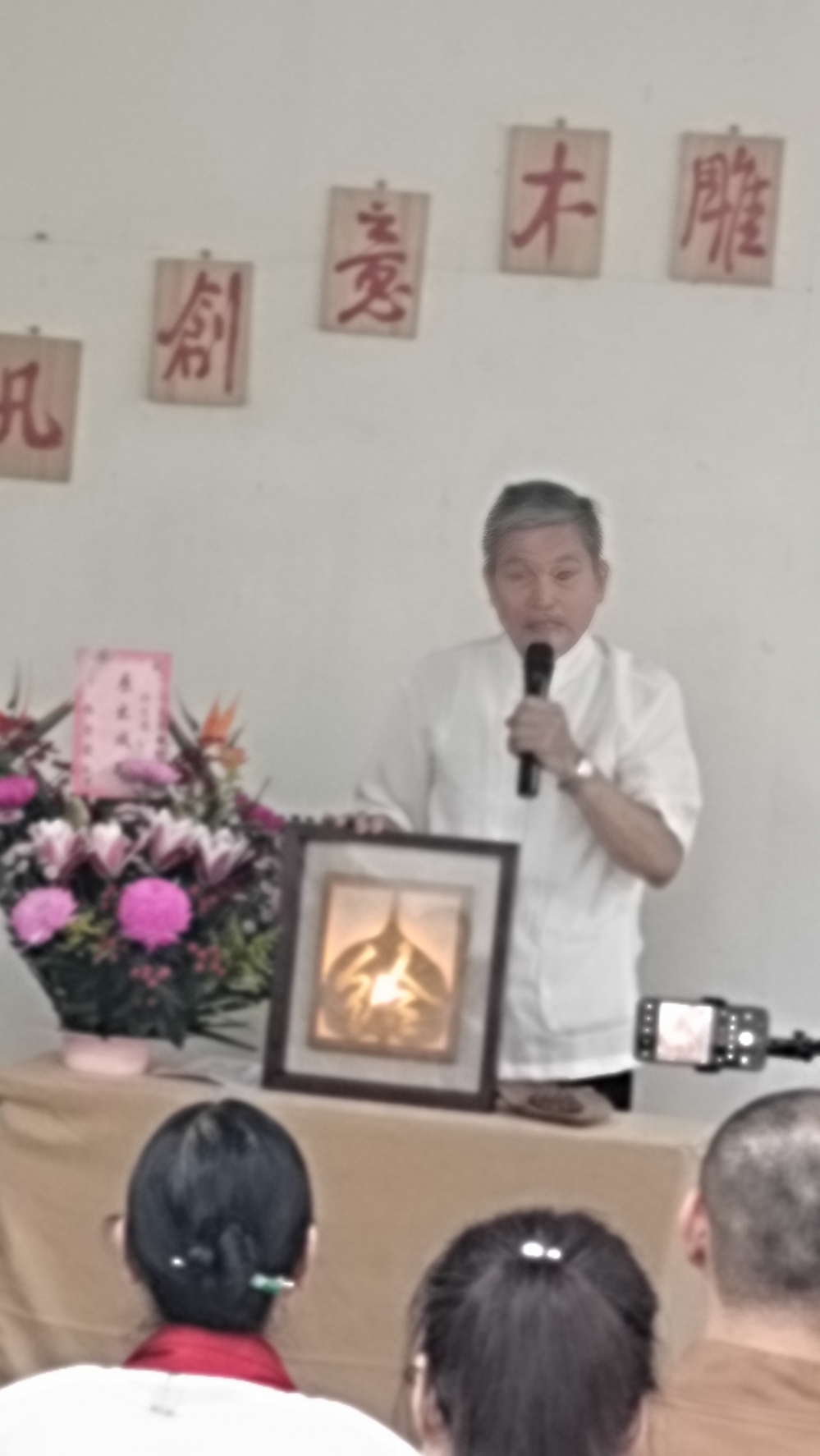 三位學員代表亦分享學習心得:張美蓮師姊歷時20餘天完成牆面「五百羅漢」畫作,展現堅持與毅力;戴繡貴師姊則提出未來可結合AI科技與木雕創作的發展方向,並感謝老師長期指導;胡穎珍師姊分享初學時的心境轉變,從品茶觀察師生互動中萌生興趣,進而投入創作,並嘗試以影像紀錄學習歷程,促進交流分享。