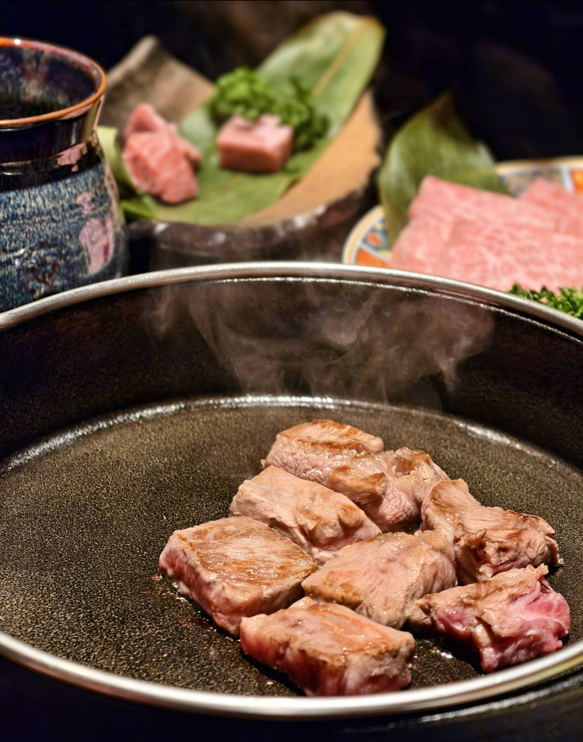 料理設計上,以關西風壽喜燒為主軸,從高溫鑄鐵鍋輕刷和牛油開始,經由蔥香、糖香層層堆疊,帶出經典甜鹹交織的迷人風味。前菜「日本海膽烏魚子粉豆腐」、溫潤細膩的「帝王蟹茶碗蒸」,以及茶香清雅的「玉露鮮蝦真丈湯」,層層鋪陳出日料的細膩節奏,為主餐揭開序幕。