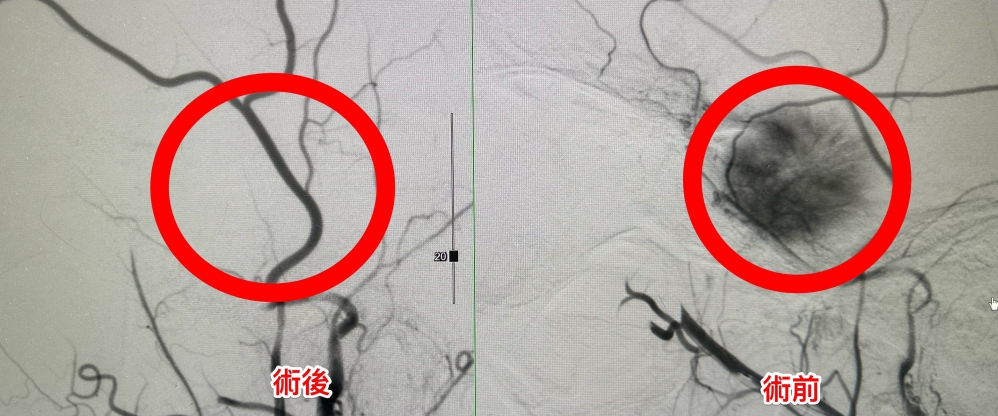 放射科醫師黃竣聖表示,透過術前腦血管攝影與三維影像重建,可清楚呈現腫瘤供血動脈與主要腦血管之立體分布,進一步辨識腫瘤的主要血源,醫療團隊據此進行選擇性動脈栓塞,利用微導管將栓塞材料精準送入供應腫瘤的血管,主動阻斷其血流,使腫瘤在手術前即降血。