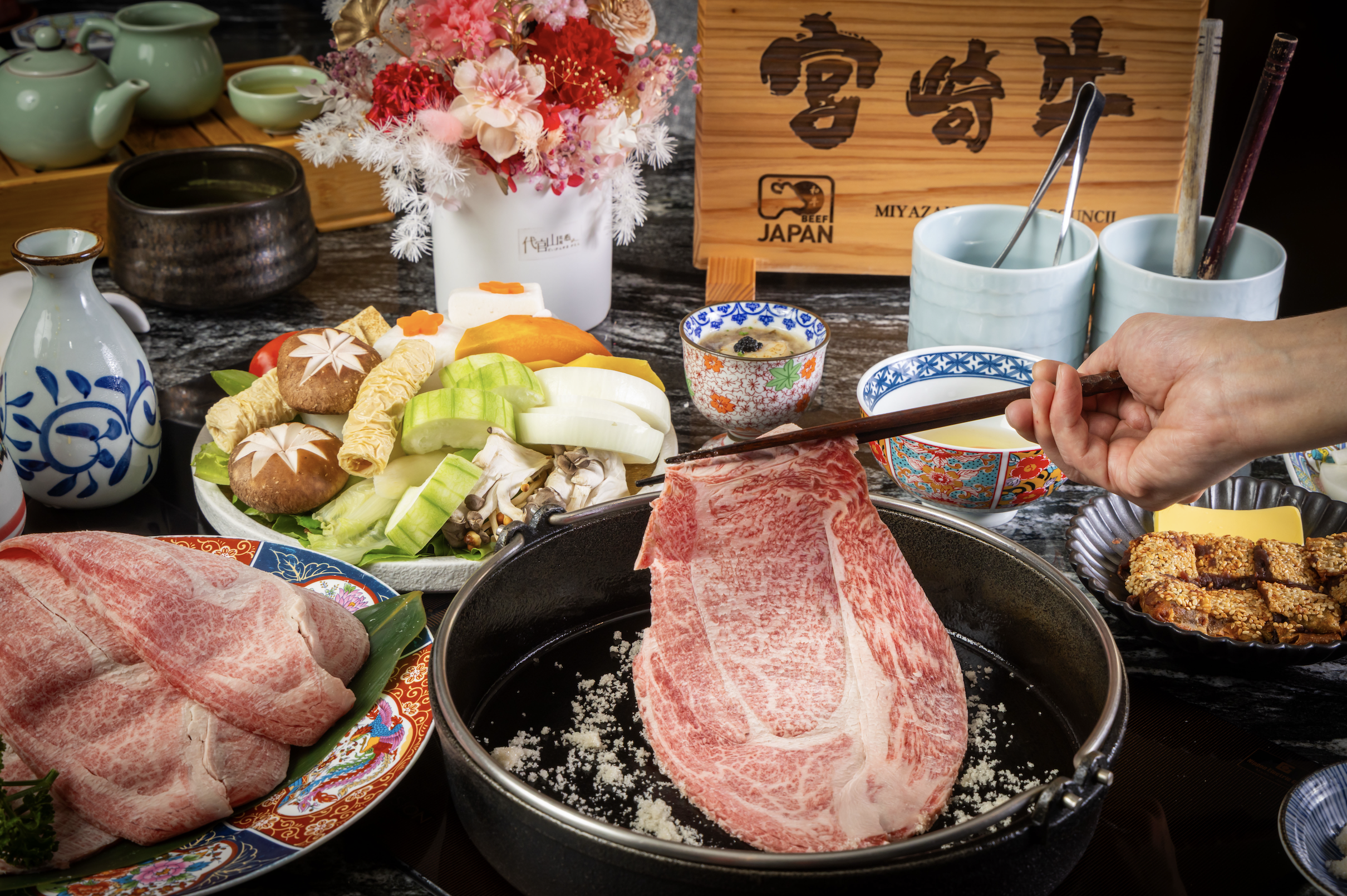 今年四月新開幕的「祇園·禪院壽喜燒專門店」,以京都祇園為靈感起點,將日式職人款待的細膩哲學,揉合台灣酒家菜的人情溫度與宴席文化,在一鍋熱氣氤氳之間,勾勒出屬於當代的餐桌風景。主打頂級「銘柄牛套餐」,嚴選日本三大銘柄牛,包括宮崎牛、雪姬牛與米澤牛,每日限量供應,以珍稀食材款待心中最重要的她,讓用餐不僅是味覺享受,更是一場情感的寄託。即日起至6月底,凡品嚐「銘柄牛套餐」即贈代官山花苑永生花康乃馨一束,將餐桌上的溫潤滋味延伸為一份可長久保存的心意。