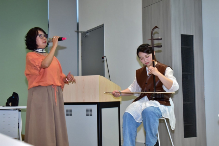 【記者林獻元台中報導】東勢許良宇圖書館25日舉辦「群山裡的爧光詩脈」客家文學講座,由東勢在地客籍詩人張芳慈,分享其最新客語詩集《爧》的創作細節,邀請客語薪傳師劉宏釗、劉惠月與談,並與陳映潔搭配進行二胡及詩詞朗誦演出。台中市政府客委會應邀為合辦單位,主委江俊龍到場與民眾一同感受客家文學的魅力,並分享閱讀後的震撼感受。