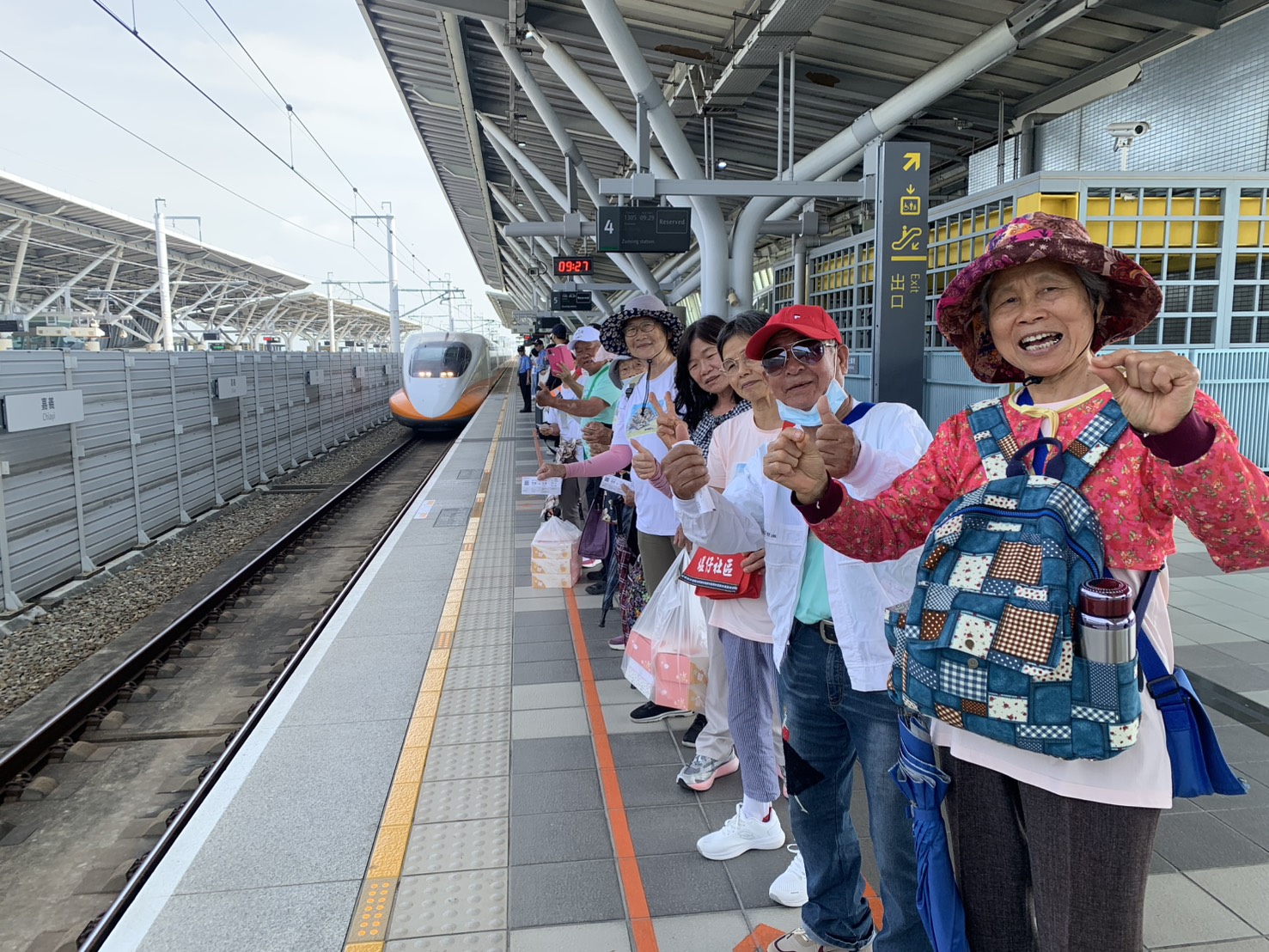 高鐵嘉義站協助塭仔社區發展協會20餘位年逾七旬弱勢及獨居的長者們,首次搭乘高鐵前往左營遊覽。(圖/高鐵嘉義站提供)