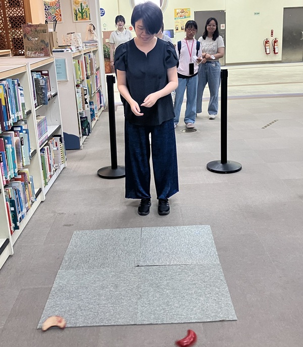 南華大學響應世界閱讀日,辦理「借書擲筊大賽」推廣閱讀,讀者擲出聖筊獲好禮。(圖/南華大學提供)