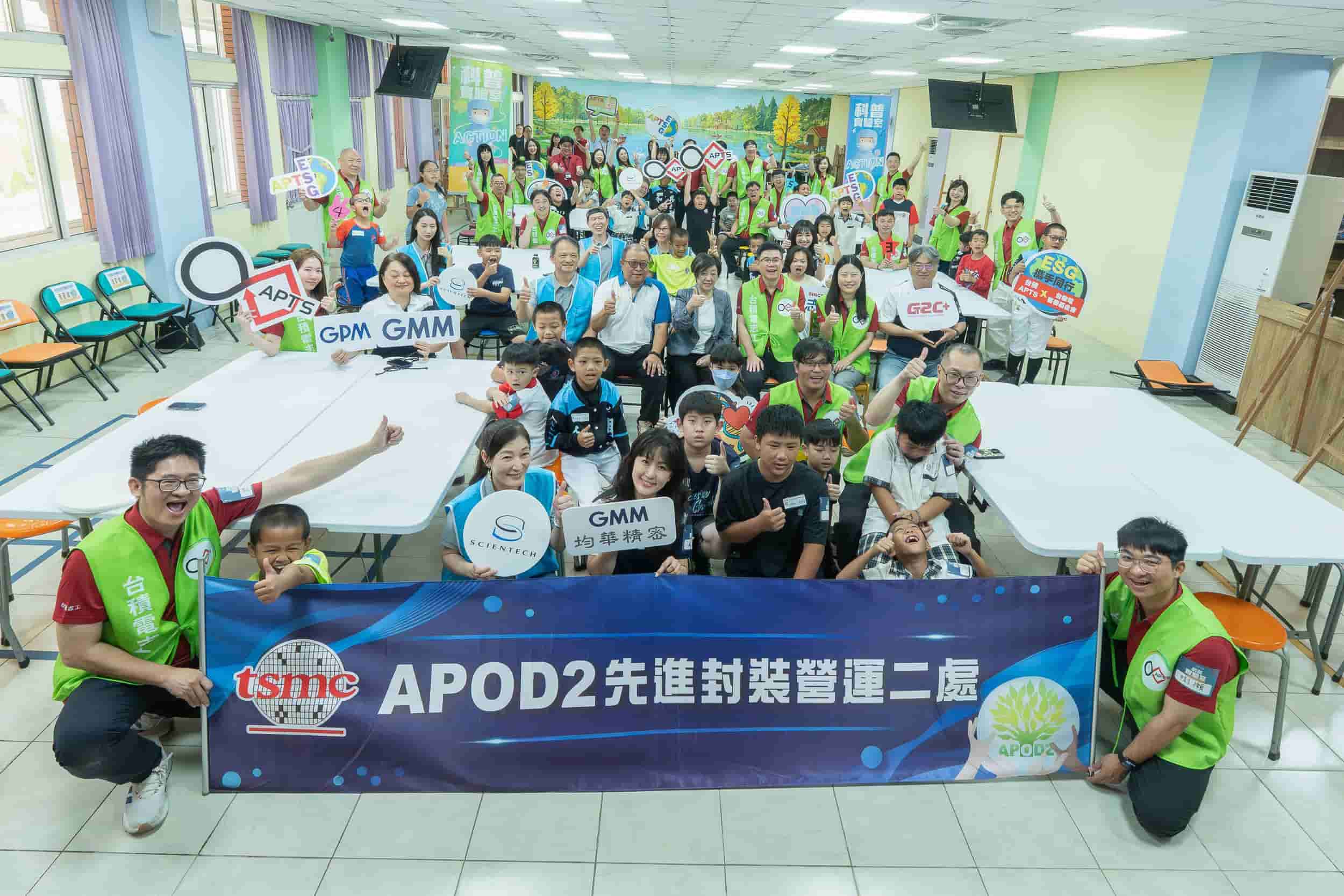 ▲台積電先進封裝技術暨服務組織(APTS)志工團隊與多家供應鏈夥伴,於嘉義縣中埔鄉和興國小舉辦「封裝積木科普」活動。