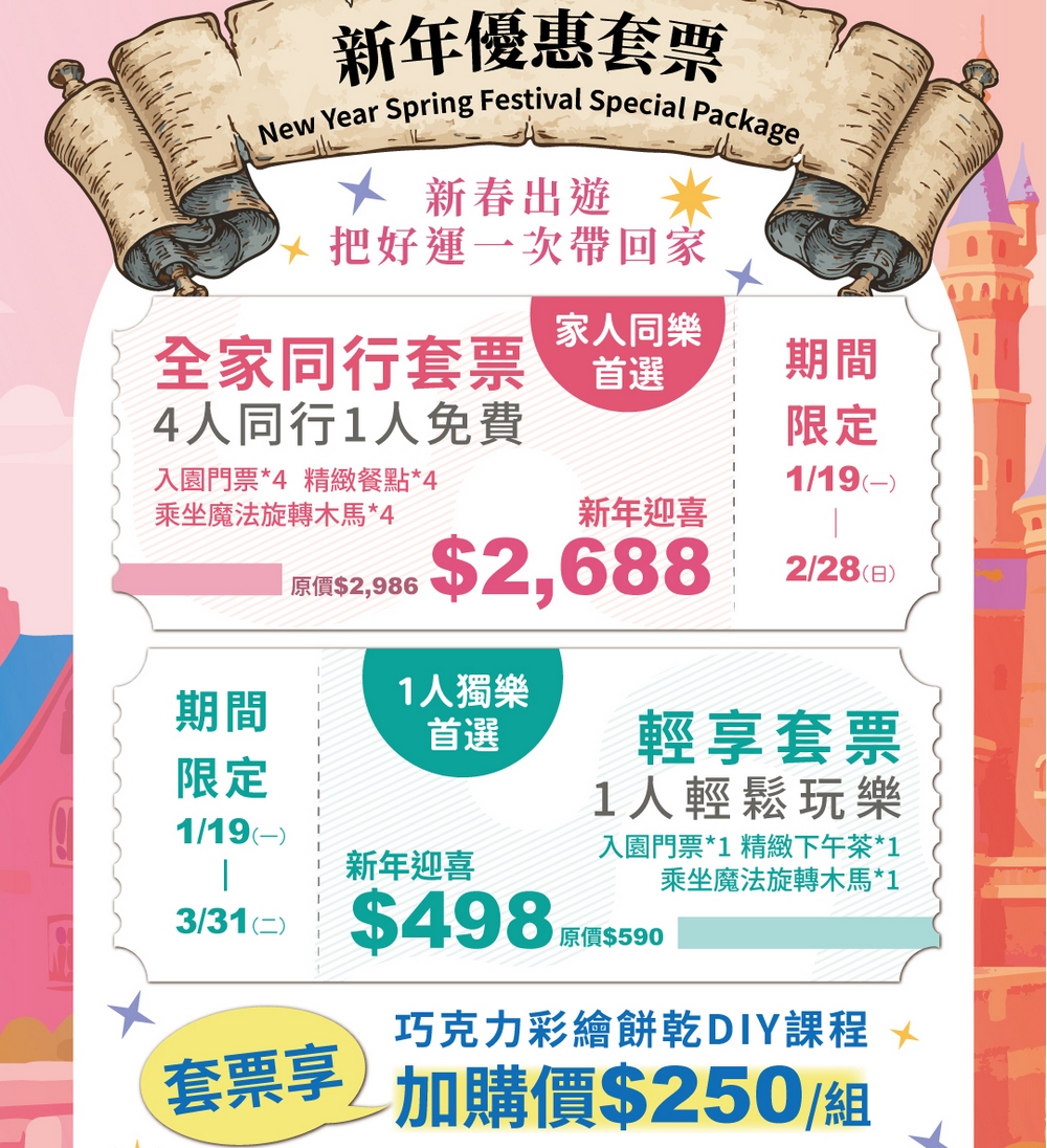 1月中旬至3月31日園區打造世界知名景點,以及經典名畫主題場景,推出「異國巡遊日記」,以沉浸式拍照體驗,運用錯視3D立體圖感,讓畫面一拍就有「人在景中走」的臨場感,不用出國也能拍出異國旅行大片。配合春節活動同步推出新年限定套票,即日起至3月31日線上開賣,只要是家庭出遊,可選擇「富貴馬上來・全家同行套票」,主打4人同行1人免費,結合餐點、飲品與遊樂體驗,讓全家一次玩好玩滿;輕量級走春旅人,適合購買「富貴暖心馬・輕享套票」,搭配咖啡甜點與旋轉木馬,享受片刻悠閒。另外可以250元加購 DIY 彩繪巧克力餅乾,就可親手創作專屬甜點,把回憶帶回家。