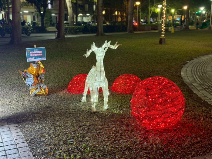 湧泉公園則於滿月指環觀景步道周邊規劃「光之迴廊」,結合可愛小動物燈飾及手捧糖果的聖誕老人,增添活潑趣味,歡迎民眾前來打卡拍照,感受濃濃節慶氣息。