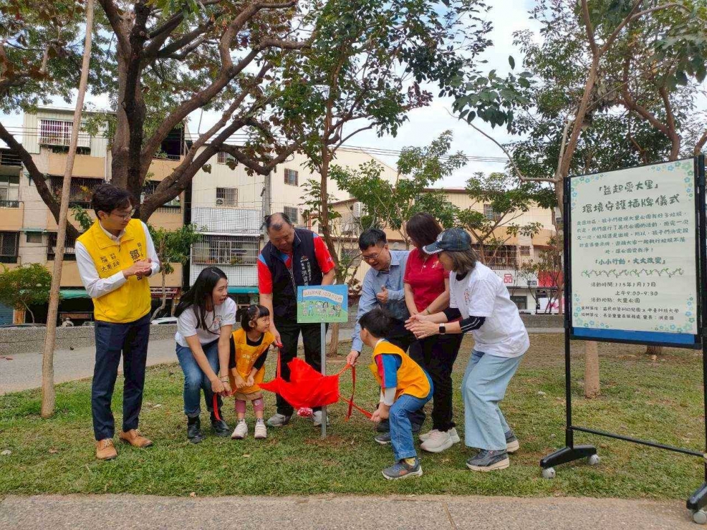 【記者張原銘、張皓傑台中報導】教育部108課綱強調核心素養的培養,期許教育能引導學生主動關注社會議題並實踐公民責任,而這份素養的奠基,正始於幼兒教育階段。中臺科技大學長期深耕幼兒教育領域,積極承辦與輔導非營利幼兒園,將先進的教育理念轉化為實務場域的養分。由中臺科大承辦的臺中市益民非營利幼兒園,17日在大里公園盛大舉辦「環保宣導牌」揭牌儀式,邀集當地里長、中臺科大兒童教育暨事業經營系主任與計畫主持人、課程專業發展輔導教授、園所師生及眾多熱情家長共同見證。這群平均年齡不到6歲的幼兒,用稚嫩卻堅定的聲音喊出「益起愛大里,垃圾不落地」,展現中臺科大承辦非營利幼兒園之扎根社區、落實公民教育的卓越成效。