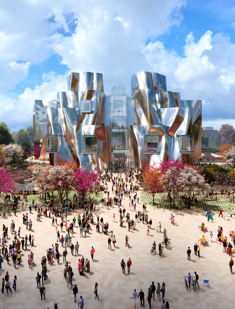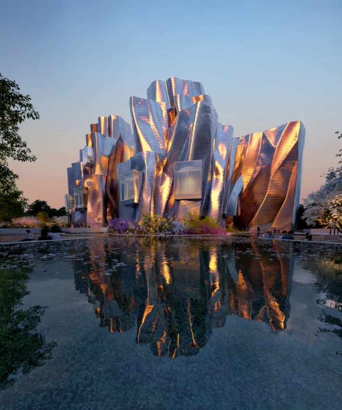 2021年4月14日Frank Gehry接受《紐約時報》專訪,已向全球推介這座美術館。他說:「靈感是以建築物、樹木和天空,一起反射在水池及不銹鋼板上的倒影為想像設計,選用較柔軟的不鏽鋼金屬作為主要立面材料,透過精密的摺疊與轉折工藝,打造出層疊起伏、流動如波的建築外觀。隨著日光與天色的變幻,建築表面折射出細緻柔和的光影,彷彿一幅絕美水彩畫般靜謐且靈動」。