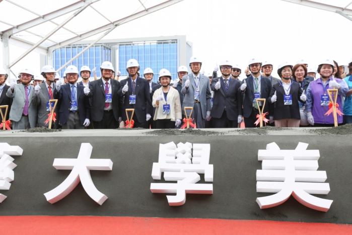 中國醫藥大學美術館動土典禮現場,由中醫大暨醫療體系蔡長海董事長(左二)、教育部長鄭英耀(左一)、台中市長盧秀燕(右一)及建築師代表David Nam(右二)共同出席交付儀式。(記者張原銘攝) -