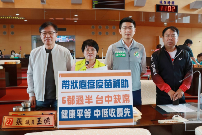 張玉嬿、謝志忠、王立任、黃守達指出,疫情之後「健康公平」受到廣泛的關注,市府有義務推進此原則,聚焦於最需要幫助的人,要求台中補助中低收老人接種皮蛇疫苗,縮小健康不平等,讓更多經濟弱勢族群優先受益。