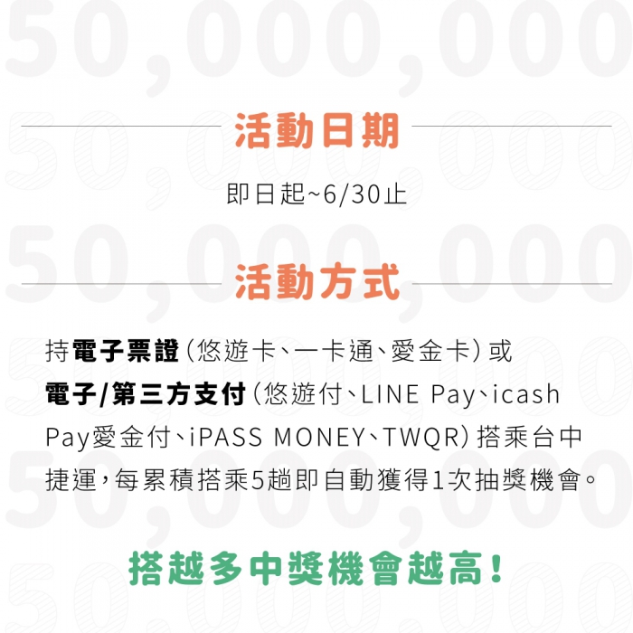 此外,中捷公司目前正舉辦「感恩民眾6月搭中捷抽好禮」活動,至6月底止,只要持電子票證或電子/第三方支付搭乘綠線,累積搭乘滿5趟就能獲得1次抽獎機會,共計超過300個獎項,6月26日免費搭捷運同樣可納入累積抽獎次數中,歡迎民眾多利用中捷,抽好禮、享便利!
