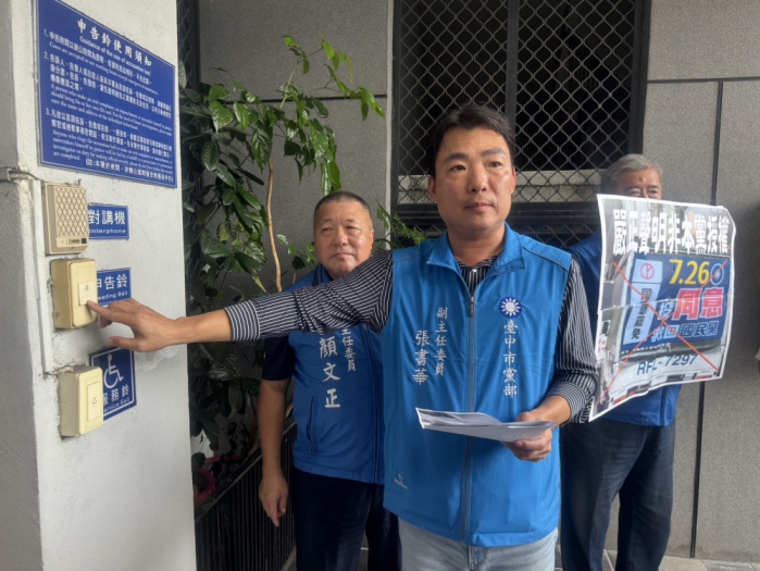 【記者林獻元台中報導】針對近日台中市街頭出現印有「7.26 投同意 救回國民黨」字樣的布條和宣傳車輛,並使用圖樣與中國國民黨黨徽極為相似的設計造成民眾誤認為中國國民黨台中市黨部參與罷免活動一事,中國國民黨台中市黨部17日下午2時30分於台中地檢署前召開記者會,嚴正澄清並按鈴申告。