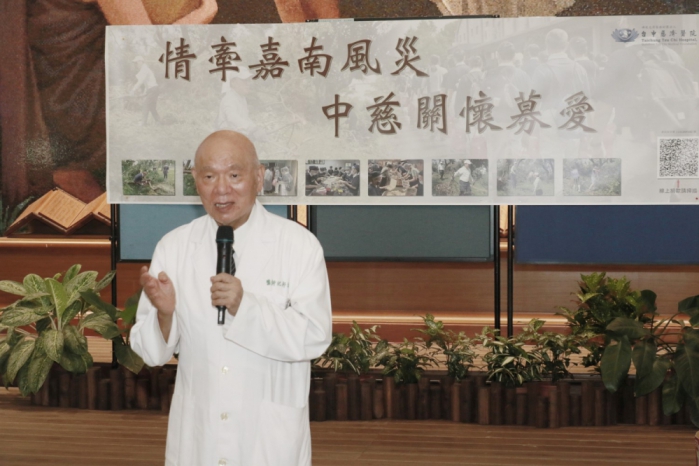 惜福市集活動前播放嘉南地區風災與慈濟人救援新聞畫面,醫護及志工雙手合十誠心為災民祈福。簡守信院長表示,「丹娜絲」的菲律賓語是體驗和感受的意思,帶來的災情讓人感受世間無常、人間的苦,我們更要體驗眾人同心協力凝聚愛的力量去克服災難的過程。中區慈濟人醫會及榮董召集人紀邦杰指出,捐贈物資的人有情、購買的人有義,情義相挺人間有愛。
