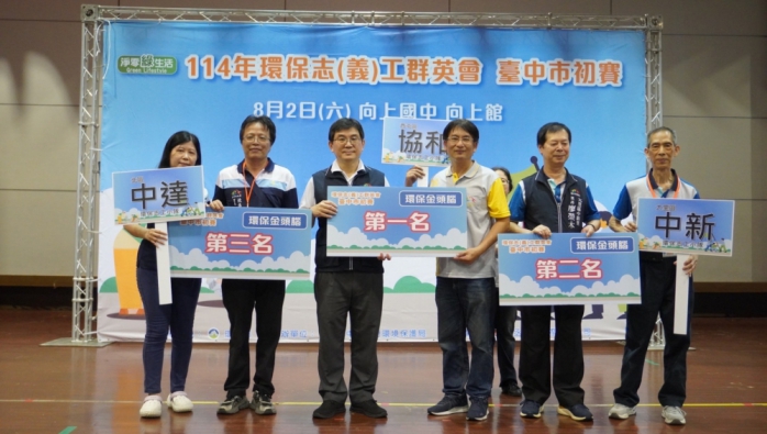 【記者林獻元台中報導】「114年環保志(義)工群英會台中市初賽」2日於向上國中熱鬧舉行,共有20組來自各區的環保志工隊伍,歷經「環保金頭腦」、「資源分類王」、「資源灌籃高手」以及「清掃接力賽」四大關卡競爭拚搏,最終由西屯區協和志工隊、安和志工隊、南區工學志工隊及大雅區大楓志工隊奪下四項競賽冠軍,將代表台中市參加11月份於雲林舉行的全國環保志(義)工群英會。