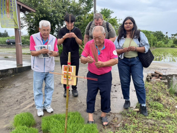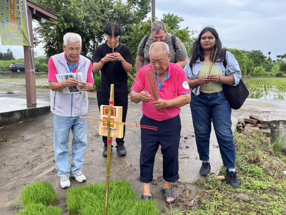 活動現場重現了傳統在田頭祭祀土地公的儀式,並插下象徵土地公拐杖的「土地公拐」,就是為了讓土地公能夠柱著拐杖,在田間巡視、護佑農民。祈福過後,來自捷克、印度、越南的國際夥伴,以及在地的小朋友們,一同走進田間,親身體驗插秧的過程,不僅延續傳統農村智慧,也讓人們重新連結對土地的敬意與感恩,讓文化的根在土壤中深植,也向世界發芽。