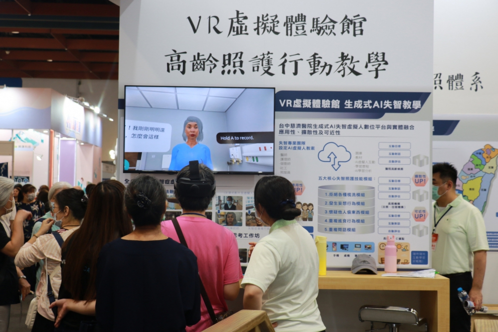 慈濟醫療與長照團隊展出內容豐富,包含智慧長照體驗區、健康檢測服務、AI肌少風險評估、中醫耳穴經絡檢測等,並展示如外骨骼機器人、虛擬實境模擬失智症等先進科技應用,讓參觀觀眾直觀體驗科技如何貼近生活。展區也推廣低碳蔬食與永續理念,設有淨斯蔬食區及靜思書軒攤位,融合健康、環保與人文氣息。