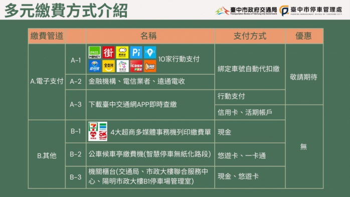 智慧停車無紙化,綁定代扣省優惠,交通局為鼓勵使用電子支付繳納停車費,提供多元的繳費方式,建議民眾可將車號綁定行動支付APP(iPASS MONEY(iPASS一卡通)、街口支付、車麻吉、Pi 拍錢包、停車大聲公、歐付寶、全支付、悠遊付、icash Pay、橘子支付),或金融機構、電信業者及遠通電收自動代扣繳停車費,可享超值優惠,也可手機下載「台中交通網」APP進行連動綁定。