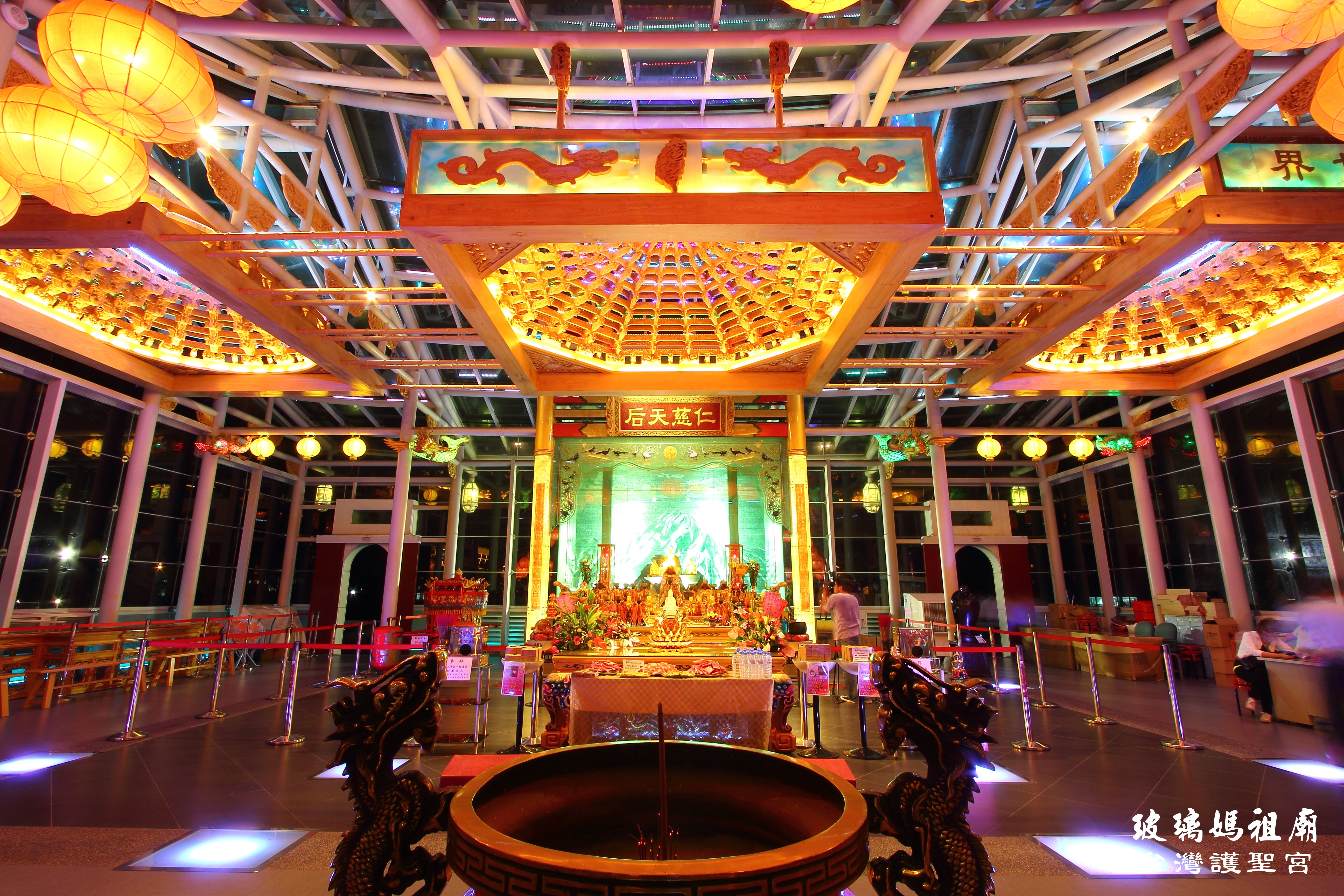 【記者林獻元台中報導】在彰化鹿港的濱海地區、台灣玻璃館的左側,座落了一間與眾不同的寺廟,經歷六年多、斥資1.2億元經費,才打造出全台唯一的「玻璃廟」台灣護聖宮。一般寺廟常用木材、木雕來裝飾,但這間玻璃廟除了主要建材,裡裡外外佈滿許多玻璃裝飾,像是門神、石柱裝飾、甚至連祭祀的媽祖也為玻璃製作。