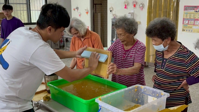 他們運用坪林社區當地種植水梨後剩下的紙袋與梨葉,製作出富含地方意象的再生紙,讓廢棄資源獲得二次利用與新價值。活動期間,邀請在地長輩與孩童一起動手體驗手抄紙過程,從材料處理到成型晾乾,親身感受資源再利用的過程與意義,完成的再生紙不僅成為描繪坪林風情的畫布,還被巧妙運用於祈福卡、燈籠等活動物品,延伸更多實用價值。團隊表示,希望透過這樣的活動,既保存社區的人情與記憶,也讓永續理念在日常生活中深耕發芽,促使農業廢棄物轉化為環保資源,展現農業廢棄物的再利用潛力,提升社區永續發展的可能性。