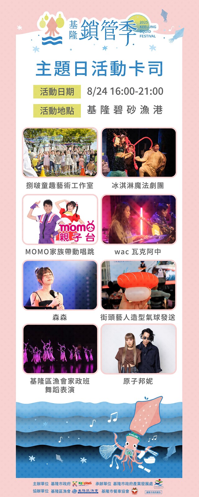 基隆最受歡迎的夏日海洋慶典「2025基隆鎖管季」主題日活動,將於8月24日(日)在碧砂漁港盛大登場!從白天到晚上,活動集結80攤海味市集、鎖管免費試吃、海洋手作DIY、人氣卡司舞台演出與經典夜釣體驗,為遊客獻上最道地、最有基隆味的夏日祭典。