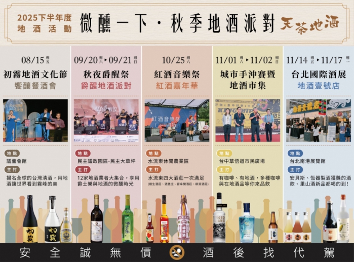農村水保署臺中分署表示,接下來9月至11月將依序還有秋夜爵醒祭-爵醒地酒派對、紅酒音樂祭、城市手沖賽-地酒市集,以及台北國際酒展-地酒壹號店等系列地酒活動,透過結合音樂、市集、互動展演或展售推廣…等行銷模式,持續深化地酒產業的文化力與商品力,將地酒文化推向年度盛事高潮!