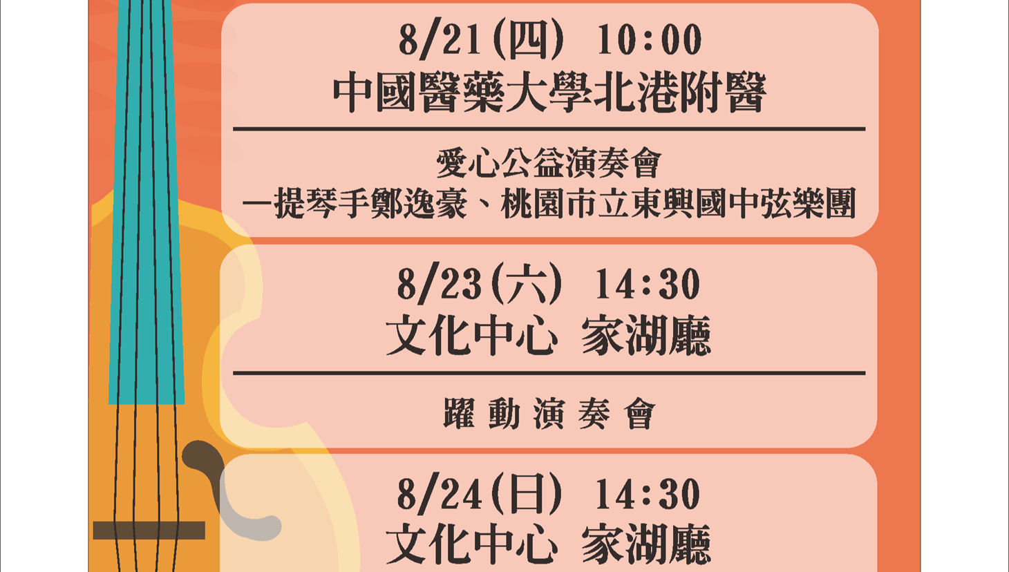 21日上午10時首場於中國醫藥大學北港附設醫院,8月23日與24日下午2時30分在北港文化中心家湖表演廳登場。(圖/記者蘇榮泉翻攝)演出場次安排為:8月21日(週四)上午10時於中國醫藥大學北港附設醫院,8月23日(週六)下午2時30分以及8月24日(週日)下午2時30分於北港文化中心家湖表演廳舉行,公益演出無需門票,歡迎各界民眾踴躍參與,一同感受音樂的純粹力量。