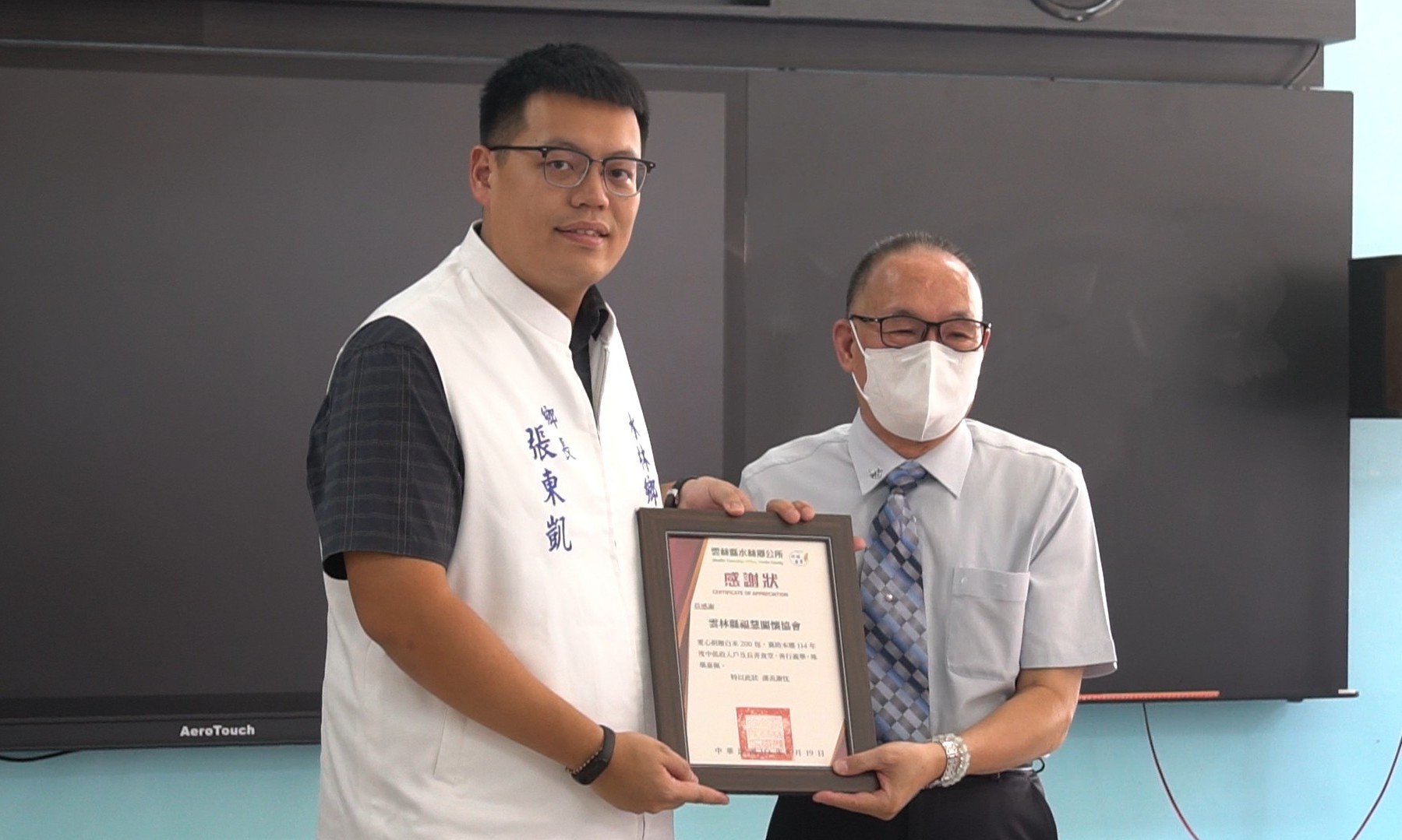水林鄉代理鄉長張東凱頒感謝狀給立委張嘉郡,感謝她拋磚引玉捐助白米。