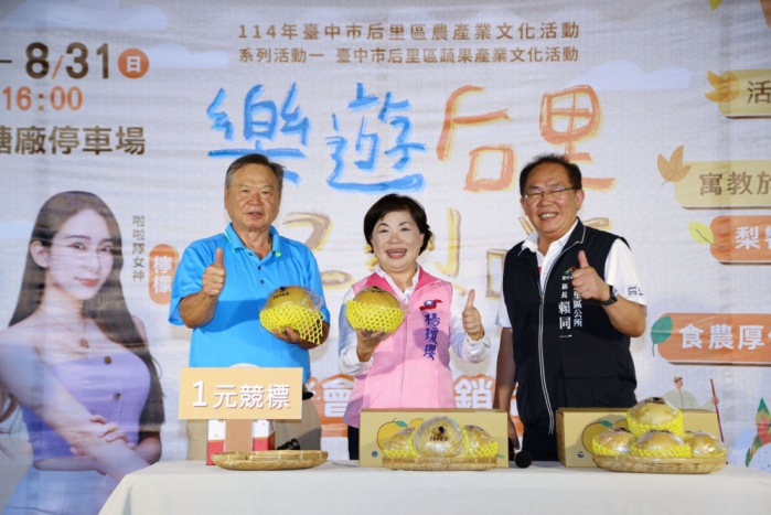 后里區長賴同一表示,后里是臺中重要梨產區,今年氣候條件優異,水梨甜度預估可達12-13度,主要品種包括新興梨、豐水梨、秋水梨及寶島甘露梨,不僅營養價值高,更是夏日消暑聖品。