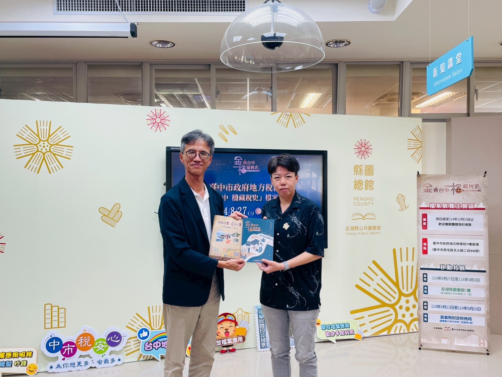 沈政安進一步說明,檔案是個人與國家的重要史料,也是歷史的重要見證,藉此檔案展主題,精心編纂出版《金典台中 檔藏稅史:用地價稅說台中故事》及《世紀印花 台中風華》2本稅史書籍,完整記錄台中超過一甲子的地價稅史及百年印花稅票演變歷史,此行特別贈予澎湖縣圖書館典藏,讓鄉親們可以從不同角度認識地方稅制,並體會檔案背後所承載的社會記憶與歷史價值。