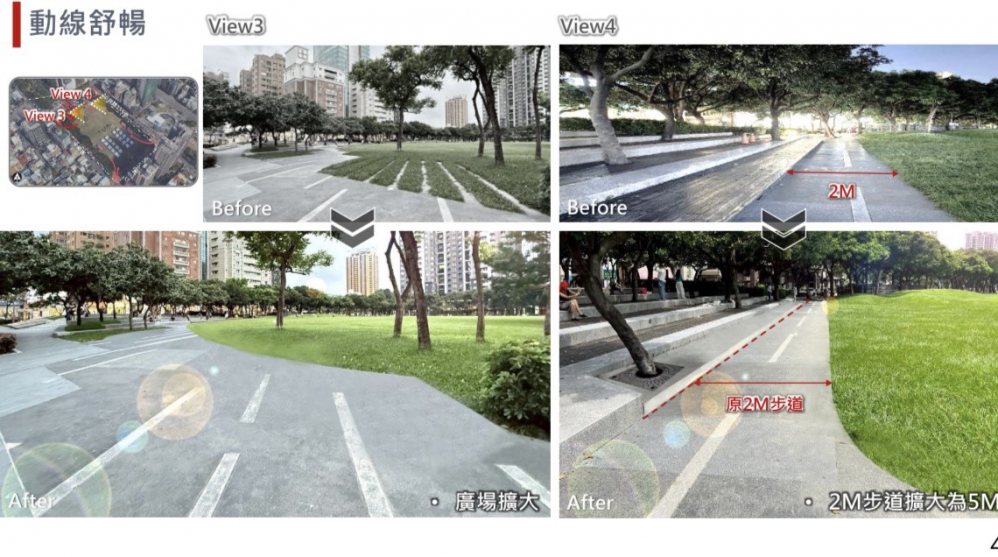 此次優化後,人流動線將由2米寬加大為6米至10米寬,也將凸字型或老舊影響動線的木平台及花崗石材質座椅拆除移設,提供更平順寛闊的無障礙通行環境;另考量照明安全,也提前將舊式LED燈更換為新式更節電的高照度LED燈,優化工程預計9月底前完成。