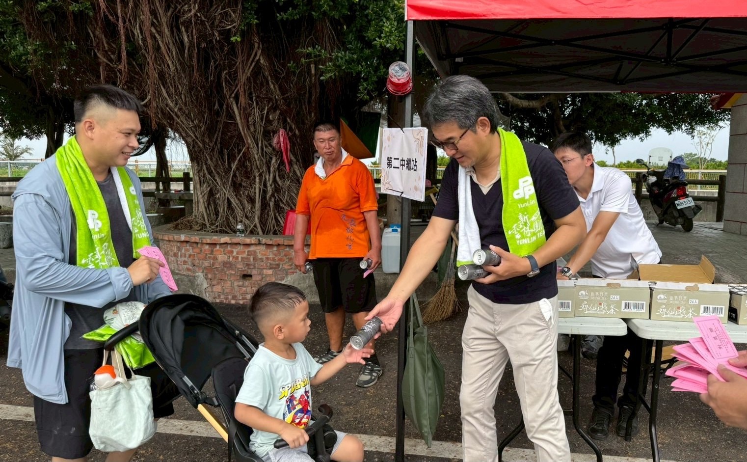 民進黨雲林縣黨部主委劉建國立委發放每位餐與活動民眾飲料補充體力。