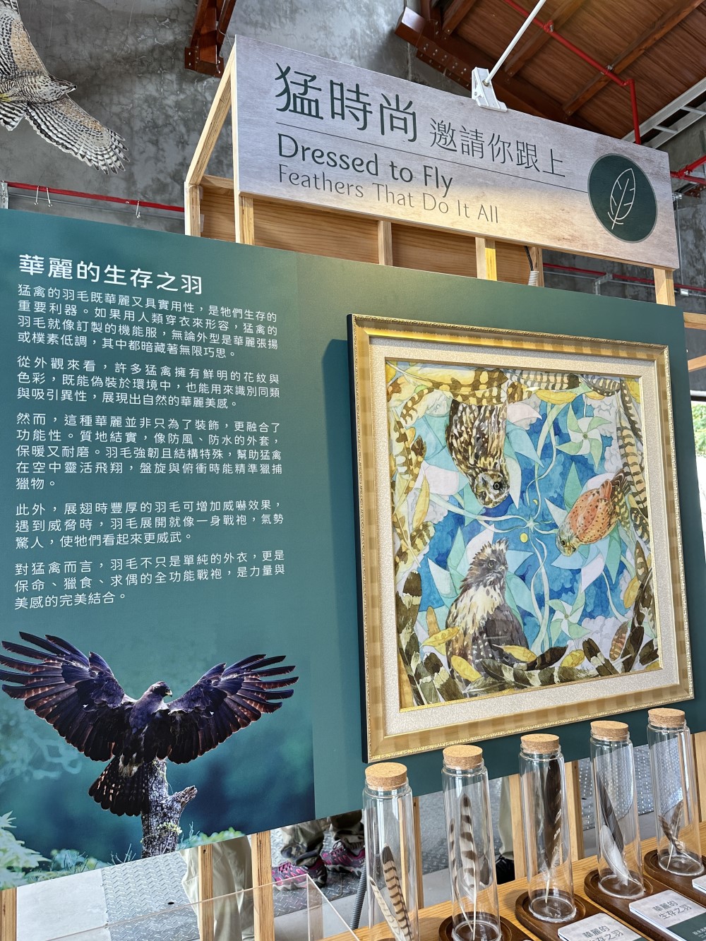展覽中以猛時尚介紹猛禽身上的羽毛兼具識別求偶與保暖生存的功用。 -
