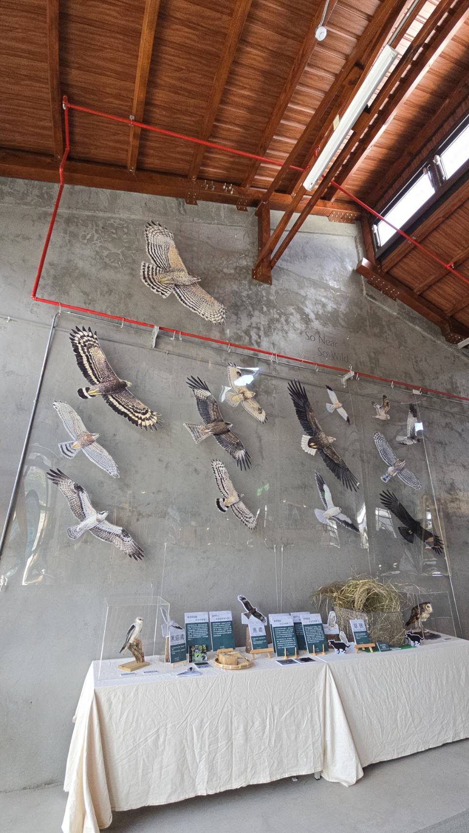 展覽中特別活用了修理工廠原有挑高樸素牆面,以巨幅的猛禽掛軸還原牠們掠過山林與天空時仰望牠們的美麗,更透過展出生物多樣性研究所以及臺中市野生動物保育學會提供的食繭、羽毛及黑翅鳶、草鴞等9種猛禽的全身標本,讓民眾有機會近距離觀察牠們身上野性的詩意!