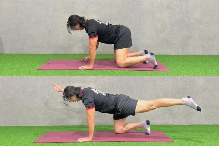 3、鳥狗式:採四足跪姿,雙膝與臀部同寬,雙手與肩膀同寬。抬起右手向前、同時左腿向後伸直,像「伸懶腰」一樣延伸,保持平衡約10秒後換邊。