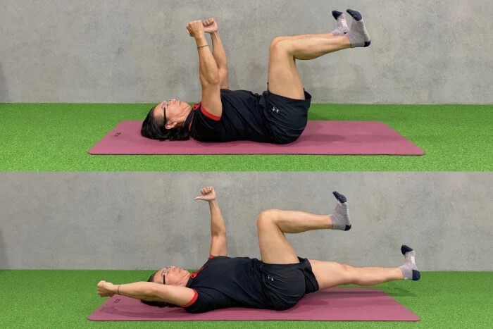 2、死蟲式:平躺於瑜珈墊上,雙手往天花板伸直,雙腿抬起,讓大腿小腿呈90度姿勢。收緊核心,緩緩將左手往後放下、同時右腳往前伸直,回到起始姿勢後換邊進行,每側做10-12下,建議做2-3組。
