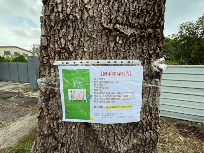 建設局提醒,施工前將於現場提前逐株張貼公告,提醒用路人注意;當天將配合交通管制措施,移除危木期間,車道作業會有行車空間縮減,請經過的民眾配合現場交維人員指揮,感謝市民朋友的理解與體諒,一同讓台中更安全宜居。