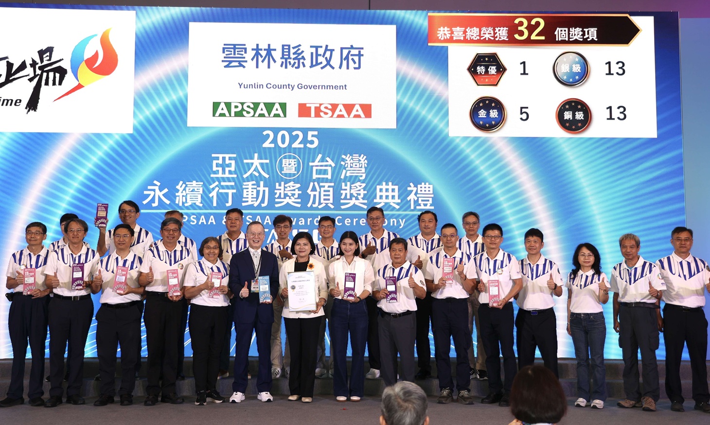 【記者蘇峯毅/雲林報導】2025台灣永續行動獎(TSAA)與亞太永續獎(APSAA)日前揭曉,雲林縣政府再度蟬聯全國最大贏家,縣府與所屬局處合計奪下37座獎項,展現縣府在永續治理的深厚實力與全方位成果。縣長張麗善榮獲「台灣傑出永續治理首長獎-地方組典範」,副縣長謝淑亞則獲「頂尖永續長獎」,縣府並首次摘下「宜居永續城市獎 Excellent City」,彰顯雲林在社會包容、低碳轉型、氣候行動等面向的卓越表現。